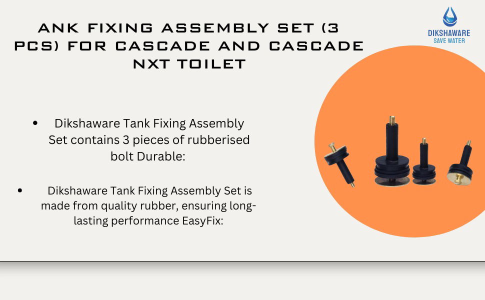 Pack Content: Dikshaware Tank Fixing Assembly Set contains 3 pieces of rubberised bolt Durable: Dikshaware Tank Fixing Assembly Set is made from quality rubber, ensuring long-lasting performance EasyFix: This Assembly set is easy to install and easy to use Refined Design: This Assembly set for tanks have a sleek design with a refined look that adds to your overall bathroom aesthetics Suitable for: This Tank Fixing Set from Dikshaware is suitable for Cascade models of all brands